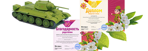 Участникам – бесплатные дипломы и сертификаты, благодарности родителям, а также игрушка-танк Т-34 (3D модель).